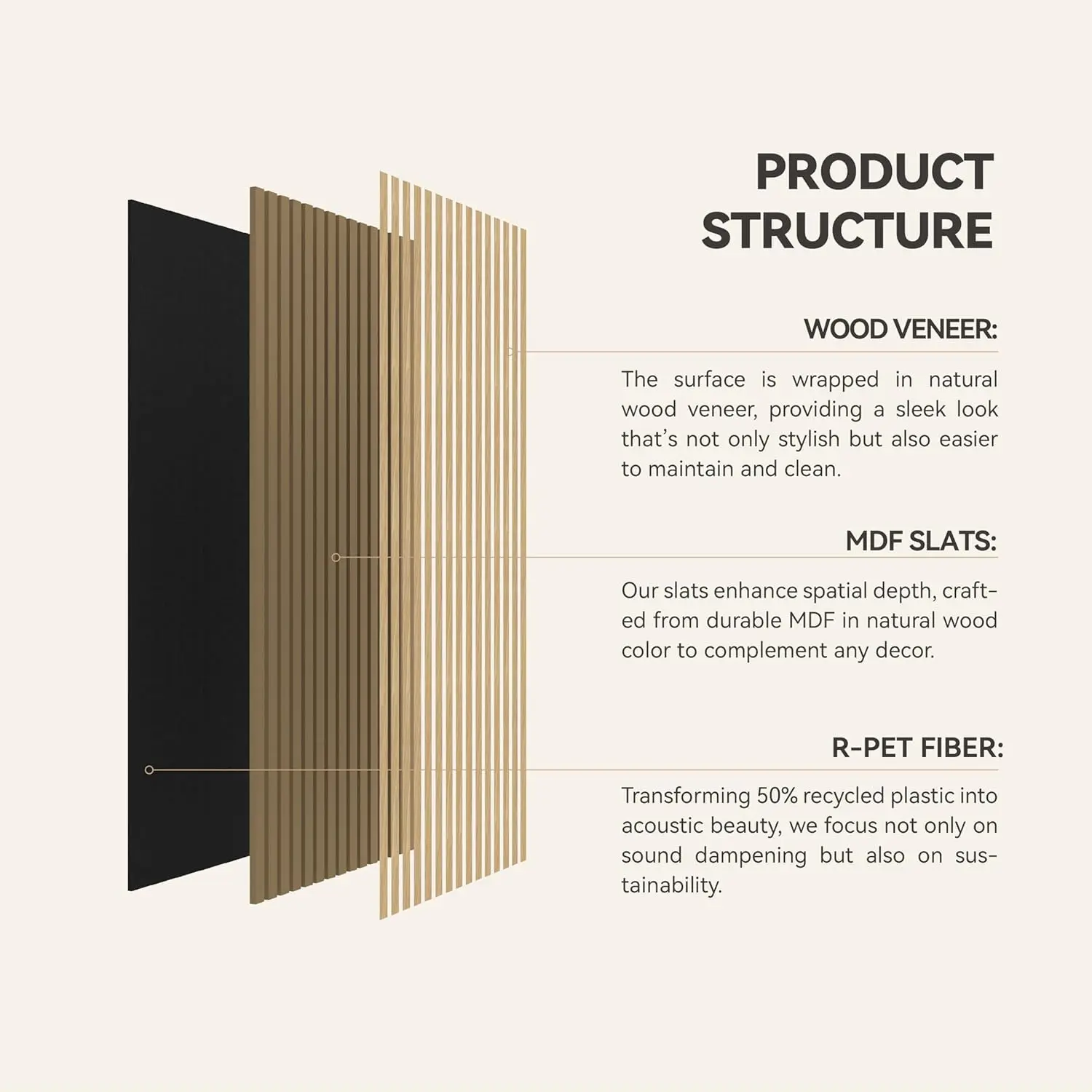 Basis: Konstrueret finér + MDF + Felt lavet af genbrugte plastflasker Overflade: Ildsikkelt behandlet / Træbehandling / Melaminbehandling |