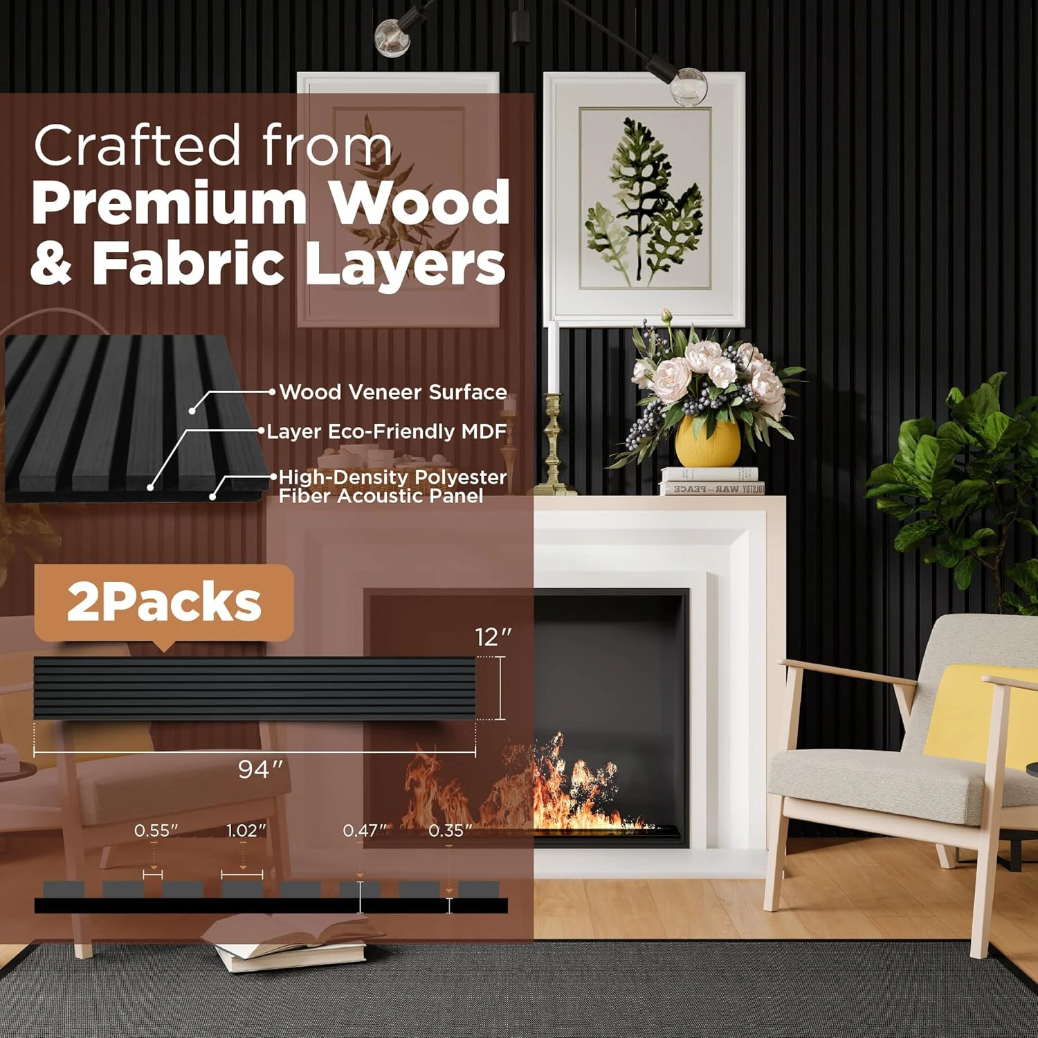 2-Pack 3D Textured Acoustic Wood Panels Walnut 47.3 X 23.6x 0.62 Inch Soundproof Wall Acoustic Slat Wood Panels